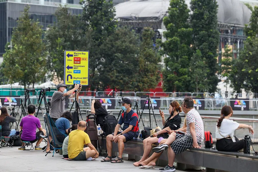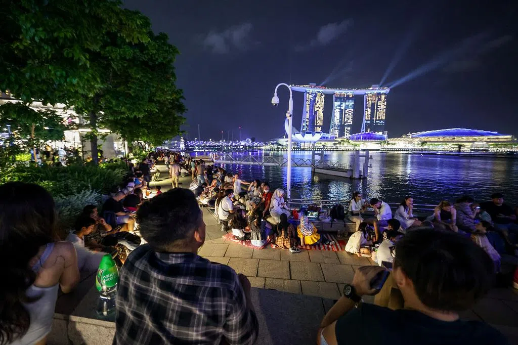 当《联合早报》记者星期六晚上8时许到滨海湾一带时,大批人潮已聚集在滨海湾金沙活动广场和富丽顿濒水区,等待午夜烟火秀的到来。