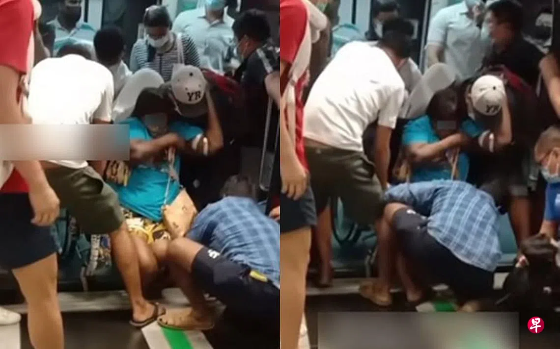 一名身穿蓝色格子衬衫的客工,蹲在轮椅前试图帮妇女脱困,与此同时,另外两名男子分别握着轮椅手把并把轮椅往上抬,他们最终成功把轮椅拉回地铁车厢。
