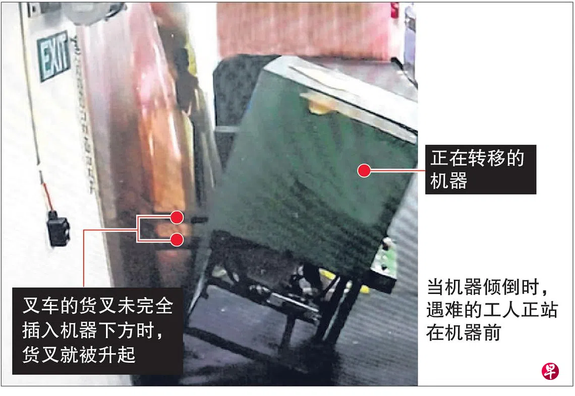 工作场所安全与卫生理事会(WSH Council)星期四(1月5日)发文告说,初步调查显示,事发时,周意来站在机器前,叉车的货叉未完全插入机器下方时,货叉就被升起,导致机器倾倒在周意来身上。