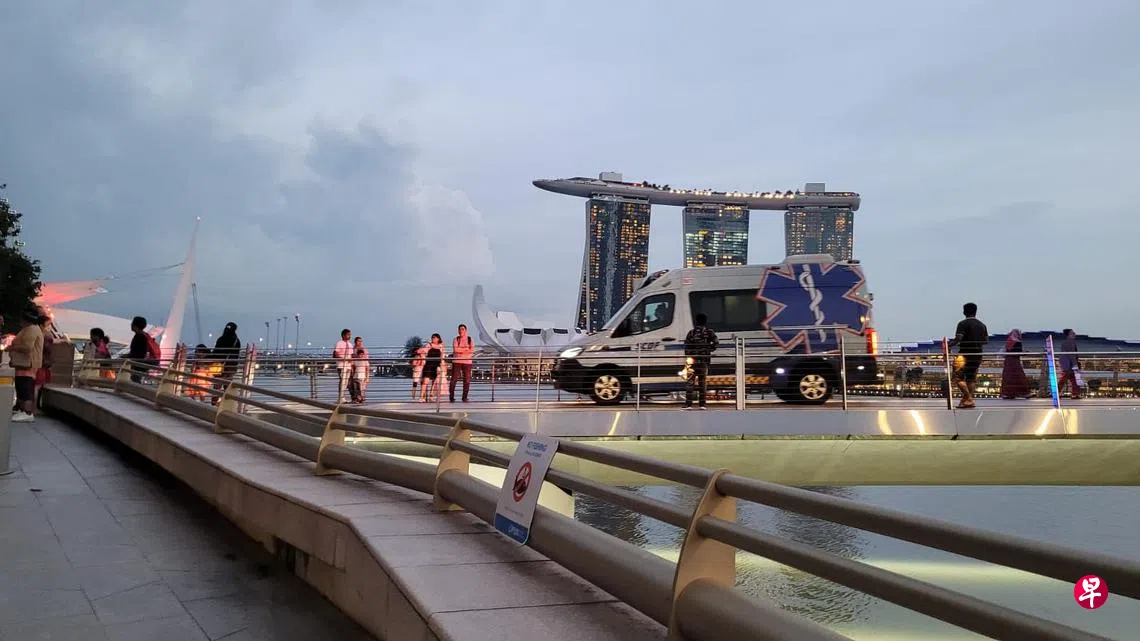 根据读者提供的照片,消防车、救护车以及民防灾难拯救队(简称DART)紧急出动,救护车也直接开进公园内。当时有不少公众在鱼尾狮公园,相信有人看见水上有异样后报警。