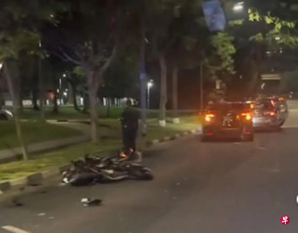 路边可见翻覆的电单车已经被撞毁,相信是涉事的车子也停在路旁,警方则向一名男子问话。