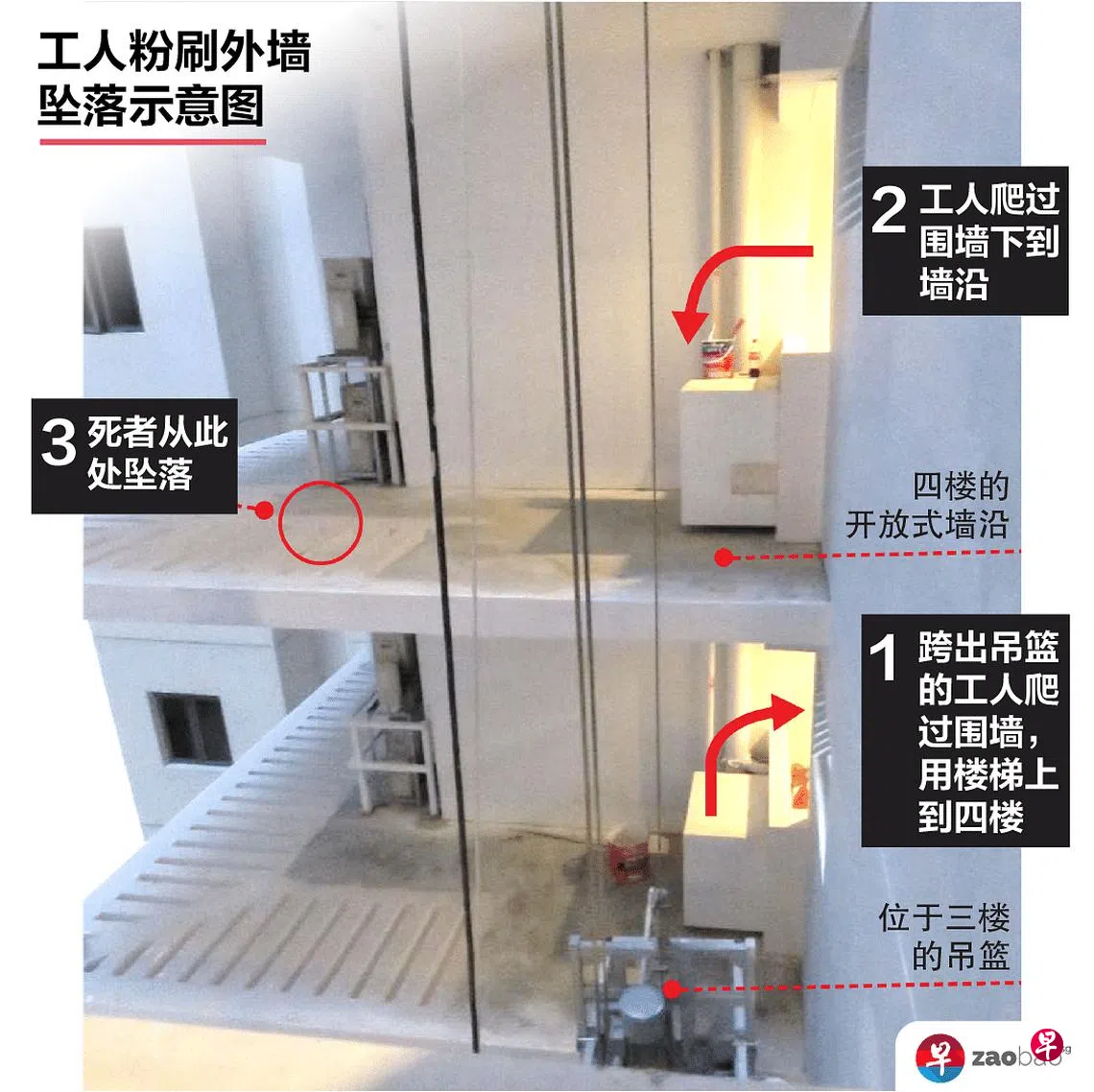 工人在四楼的开放式墙沿粉刷外墙时不幸坠落。调查显示,工人事发时有穿戴安全带,但没有把它固定好。