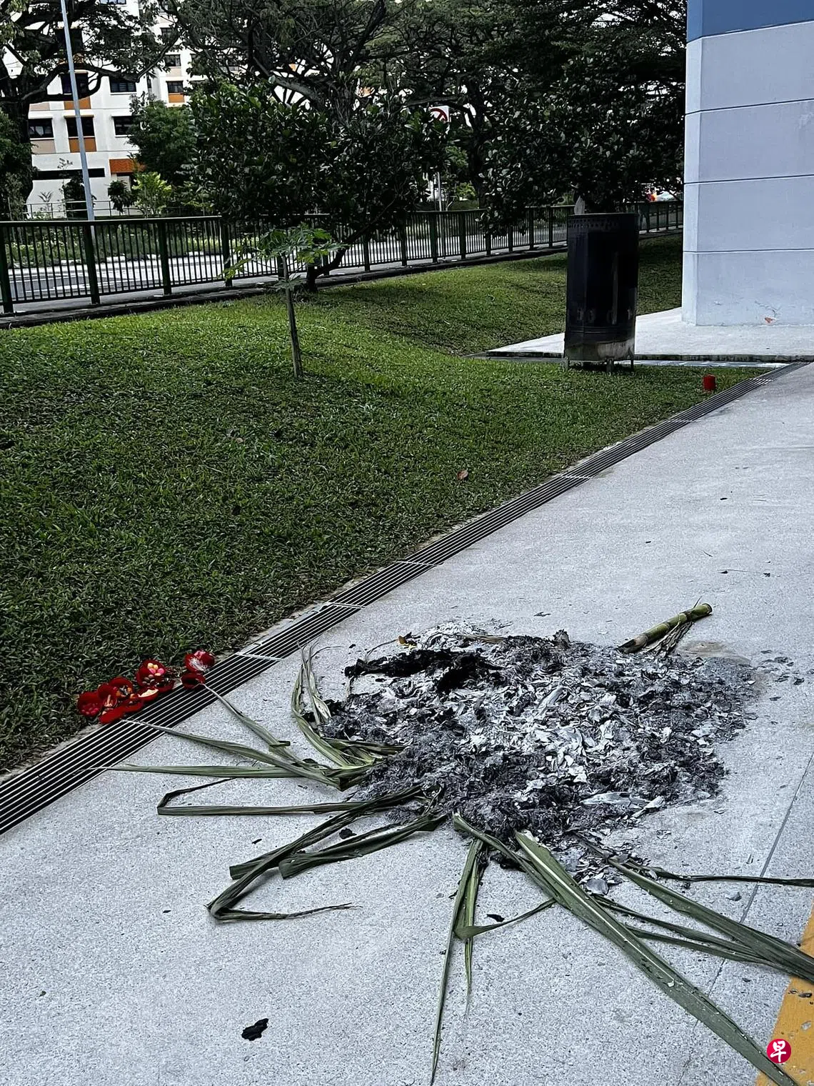 另有网民在脸书贴文,指在金吉连路(Kim Keat Link)第247座组屋楼下,距离焚烧桶才不到五米距离,有人却在走道上烧冥纸。照片中可见,地上不仅留下一堆灰烬,还有甘蔗叶。