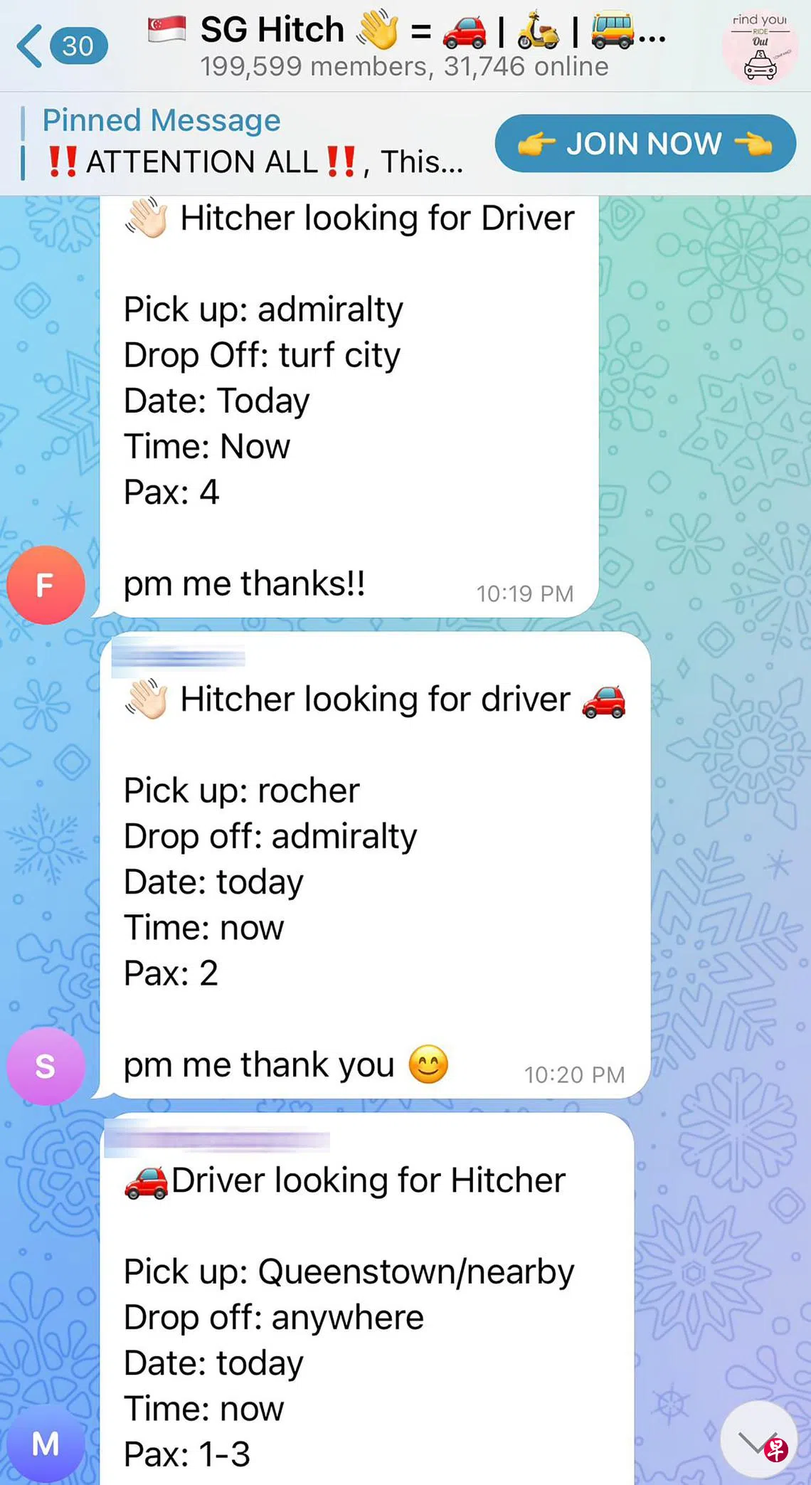 《海峡时报》报道,Telegram上有至少五个非法拼车群组,最小的群组有超过1万8000名成员,最大的群组“SG Hitch”有19万9000名成员。其中,也有女司机专为女乘客提供的拼车服务群组,有超过3万2000名成员。