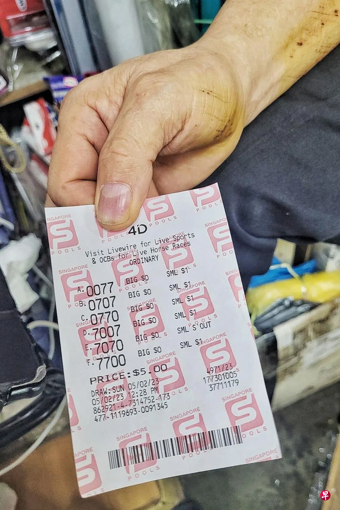 另一名幸运中奖的廖姓女公众(56岁,收银员)也喜出望外,“我花逾五元买了几组号码,最终中了1000多元,已经很开心,但听说有商家买比较大,中了一两万元。”