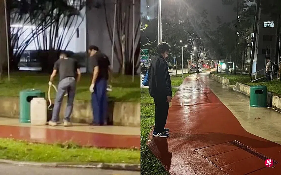 (早报讯)有蛇出没,好心叔拿垃圾桶困蛇,雨中守候一小时,提醒路过的公众。