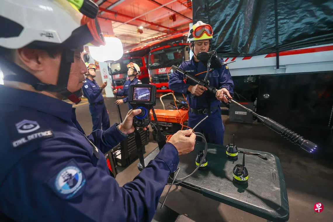 新加坡民防部队星期天(2月12日)在加冷消防局展示“狮心行动”队员携带到土耳其用于城市搜救行动的各种设备,其中包括光纤探测器(fibre-optic scope)、生命探测器(Victim Detection and Location Device),以及各种破拆工具等。
