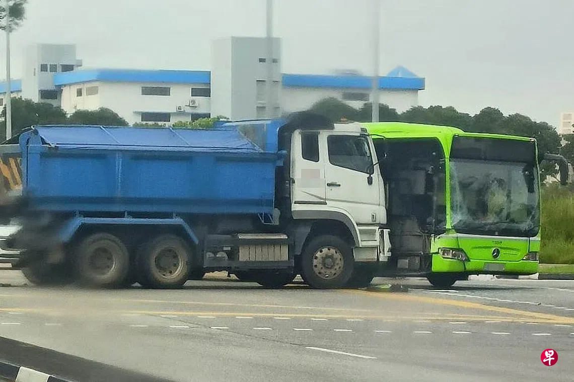 (早报讯)一辆倾斗罗厘与一辆巴士相撞,巴士右侧严重凹陷,两名巴士乘客受伤入院。