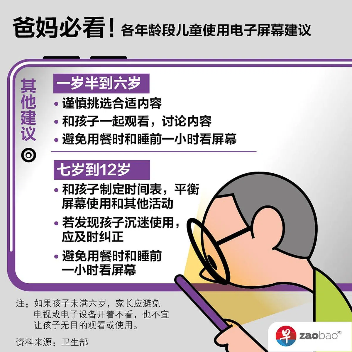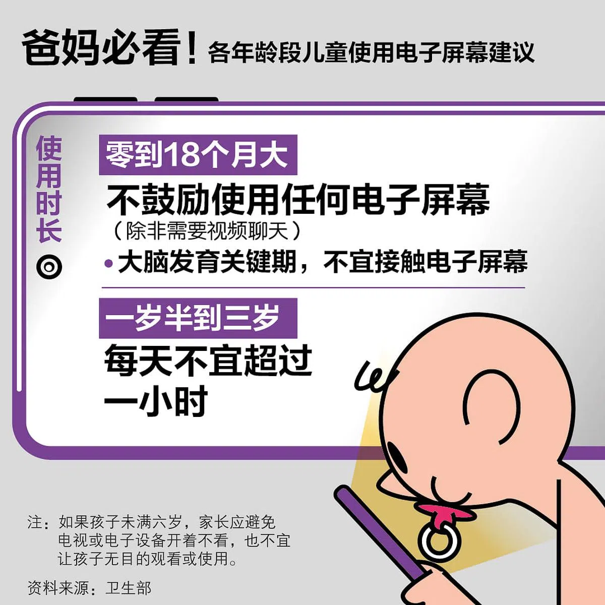 根据这项指导原则,不鼓励18个月及以下的婴孩使用屏幕,年龄介于1岁半至三岁的幼童,每日使用时间不应超过1小时。家长应慎选给6岁以下孩子观看的内容,也应陪同观看和解释内容,同时避免在用餐时间和睡前一小时使用屏幕。