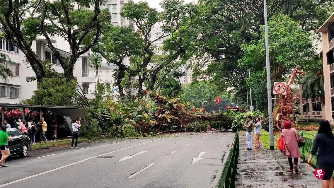 (早报讯)中峇鲁路一棵参天大树轰然倒下,将中峇鲁路拦腰截断,树干压毁了一段有盖走道和一辆路过的黑色马赛地轿车。