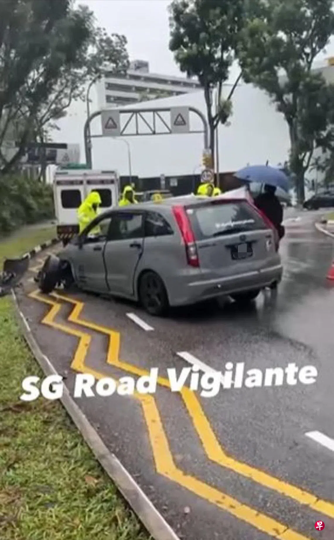根据脸书专页SG Road Vigilante-SGRV发布的视频,一辆灰色本田汽车车头的保险杠掉落在路边草地,车子的左边前轮也已脱落。现场停放着数辆警车,也有一辆吊车在一旁待命。