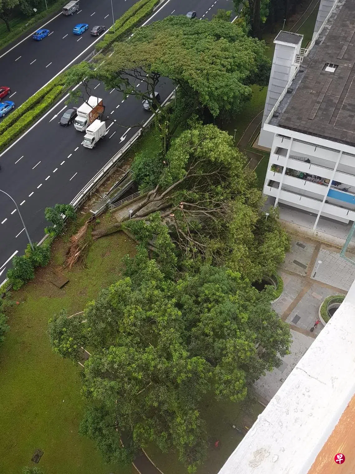 这起事件发生在星期六早上约8时许,位于巴耶利峇大道(Paya Lebar Way),靠近快速公路一旁绿化带的一棵大树轰然倒下。