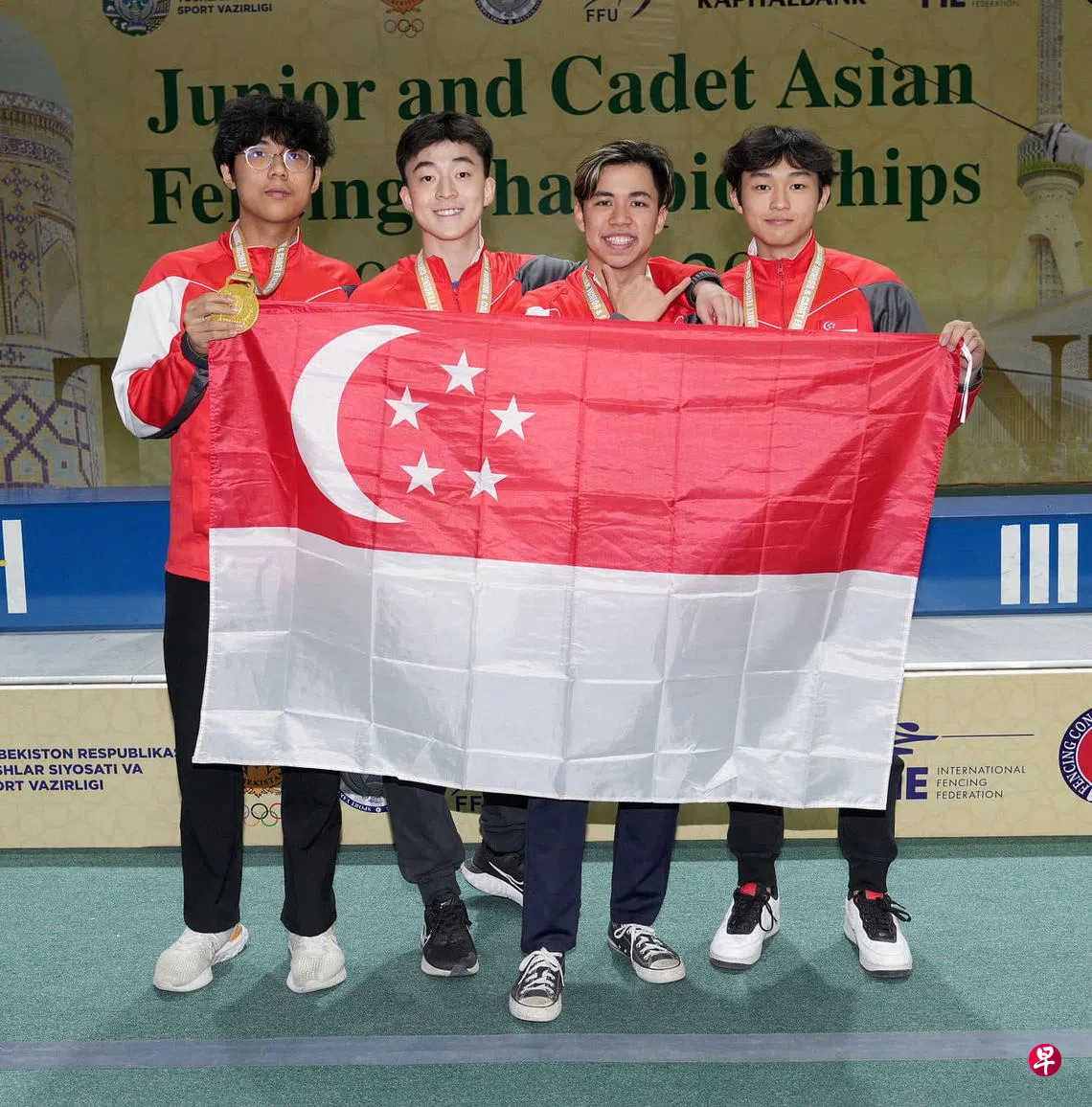(早报讯)我国击剑队在2023年亚洲青年暨青少年击剑锦标赛报捷,他们在本地时间星期日(3月5日)下午举行的男子少年组花剑团体赛先后战胜中国和日本等亚洲强敌,赢得在亚青赛这个项目的历来首枚金牌。此外,在新加坡体校求学的花剑小将胡家乐以一金一铜结束征程。