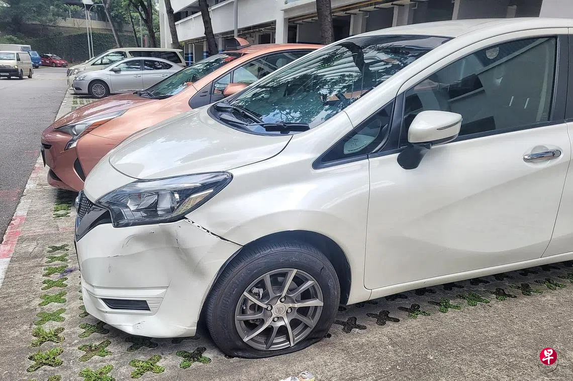 记者走访停车场时,发现有两辆白色轿车遭撞损,其中一辆左侧凹陷,左前方的轮子爆胎。
