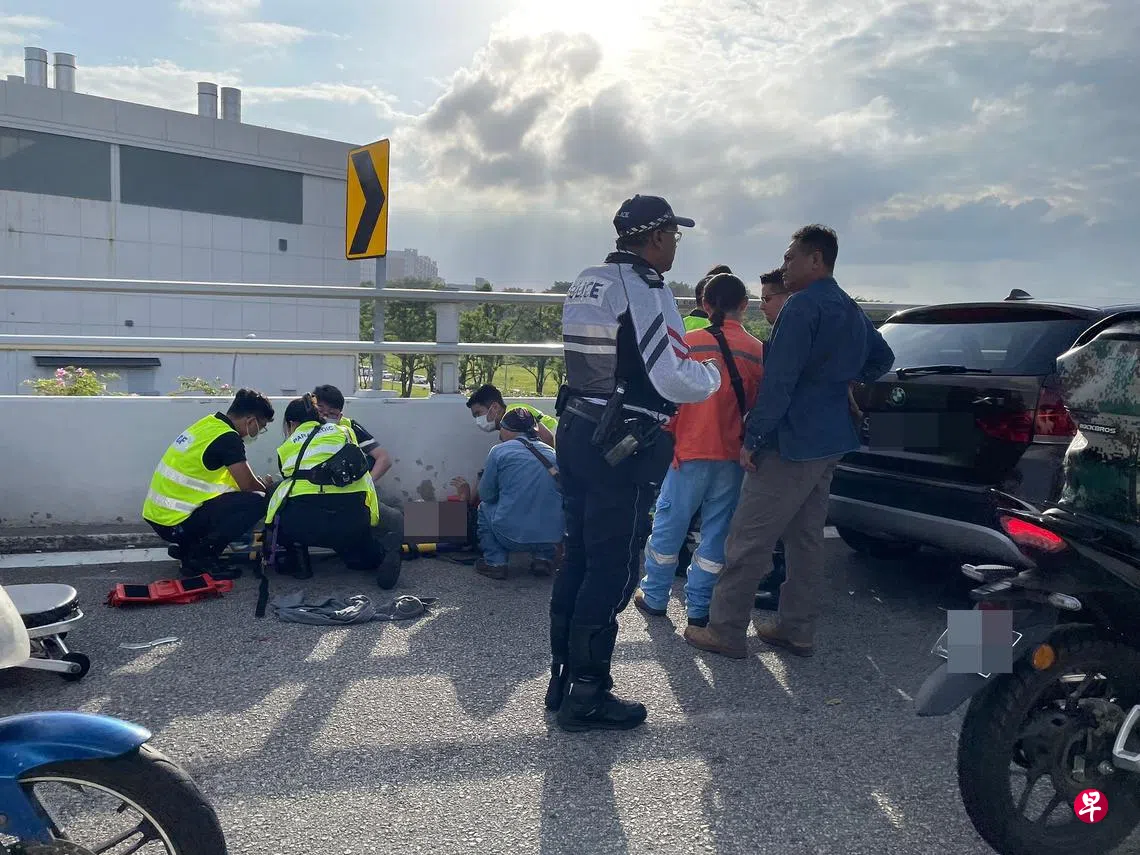 根据读者提供的照片,一辆电单车停靠在高架桥旁边,一辆褐色的汽车则停在前方,骑士倒卧在电单车和汽车中间的路段,多名医护人员赶到现场救援,交警也到场了解情况。
