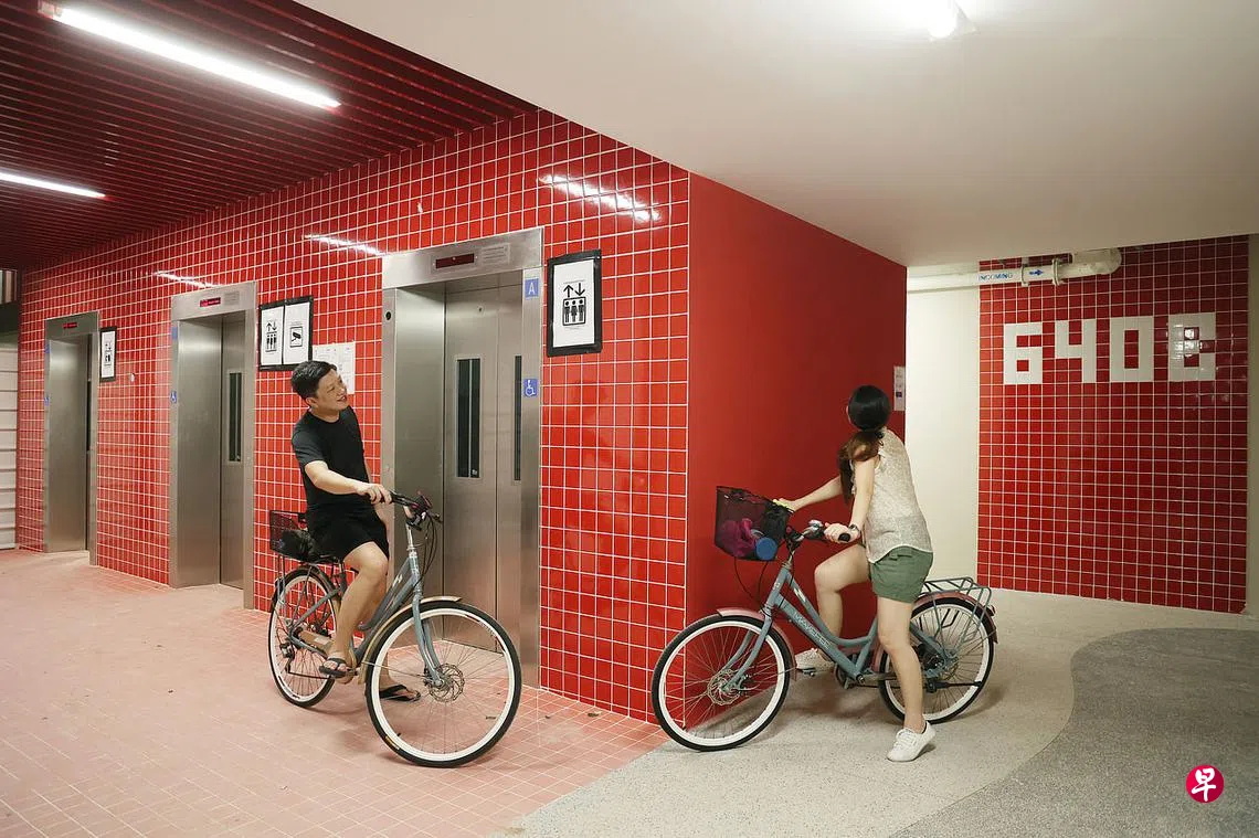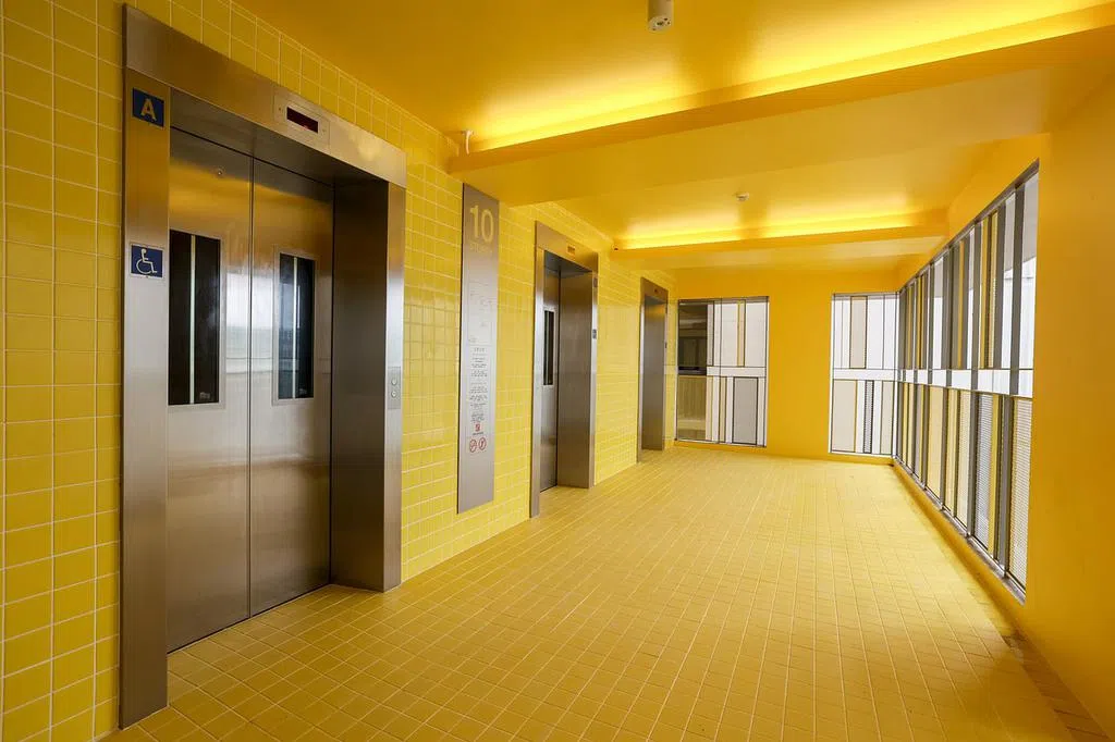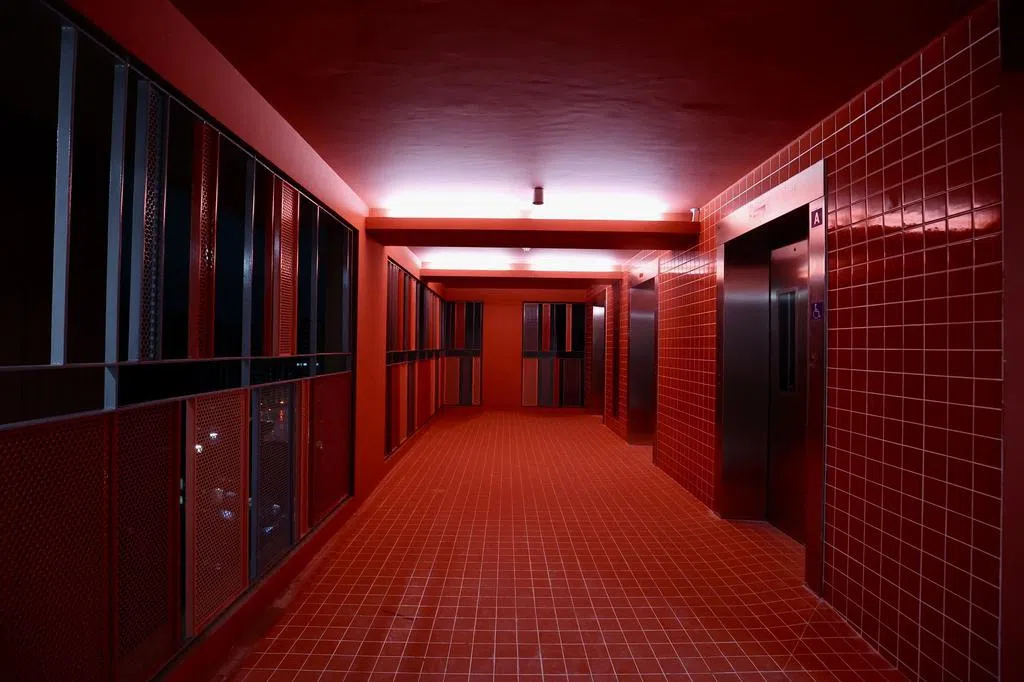 这座位于第62街一带的新落成组屋项目Tampines GreenVines,分成红、黄、蓝三色设计,其中第640B座的红色组屋,除了电梯间的地砖、墙砖以及天花板外,甚至连楼层数以及门牌号码的指示牌也是红色。