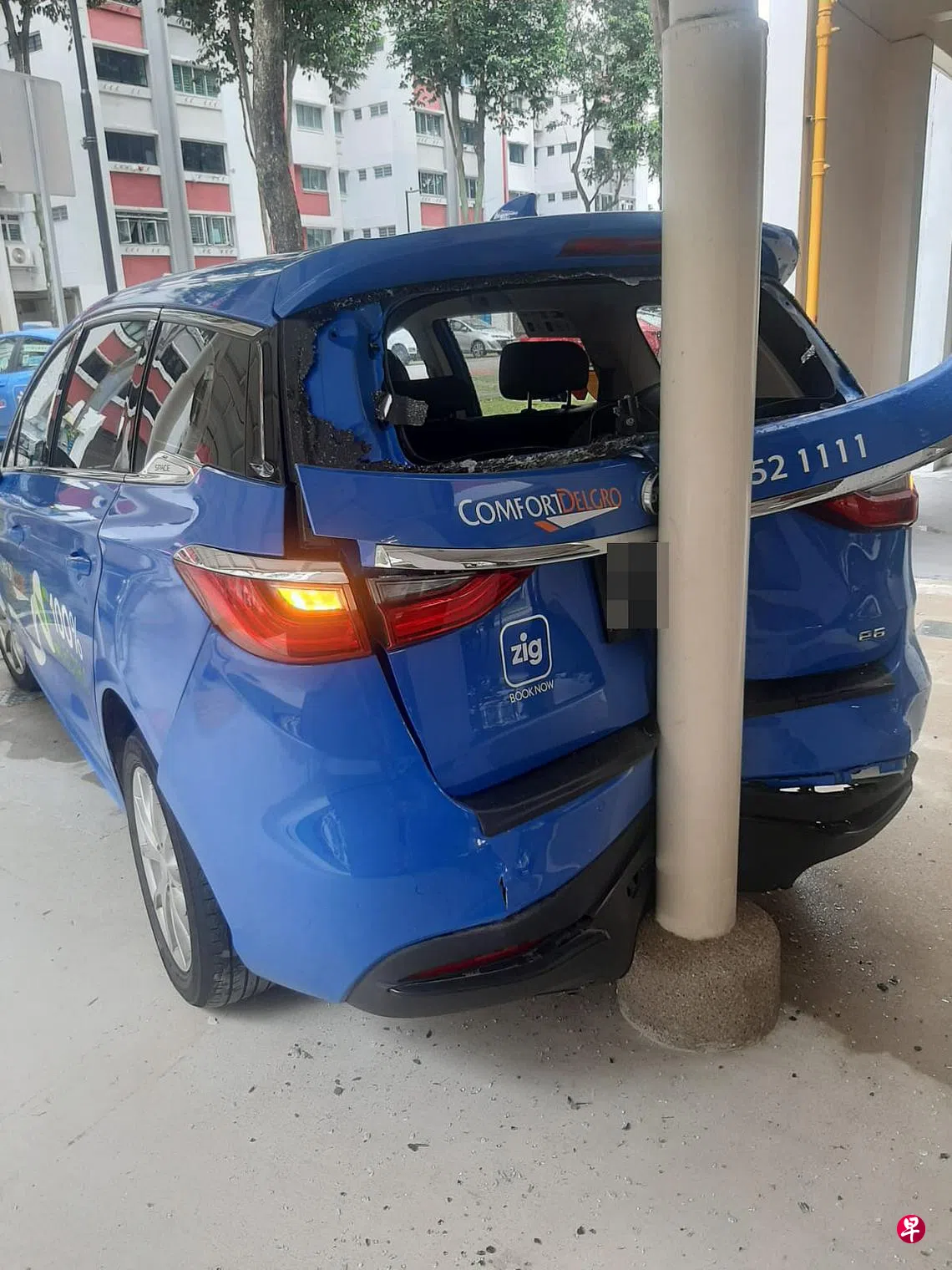 (早报讯)疑新手不熟练,德士司机在宏茂桥组屋底层倒退时,失控撞上柱子。