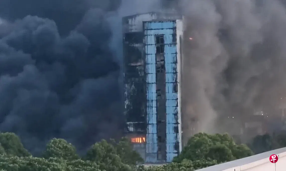 根据网上流传的画面,一座工业大楼冒起熊熊烈火,滚滚黑烟直窜天际,不时还有建筑碎片掉落下来。