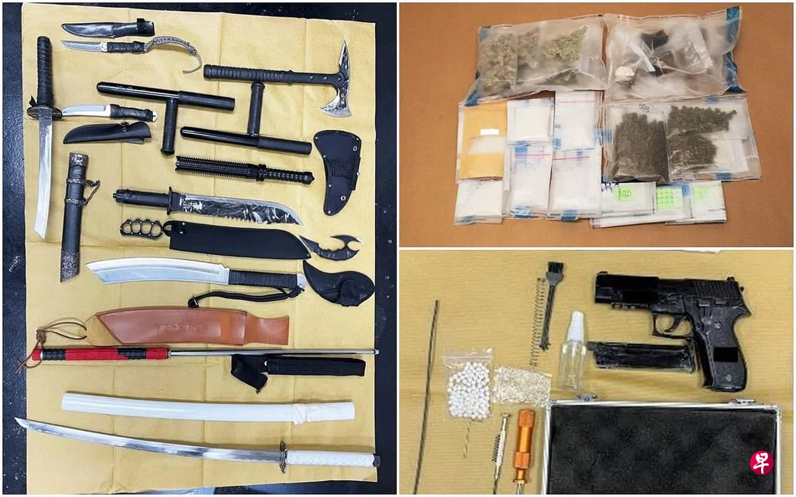 除此之外,肃毒人员还发现多种危险武器,包括一把软气枪、弯刀、剑和铁拳套(knuckle-dusters)。