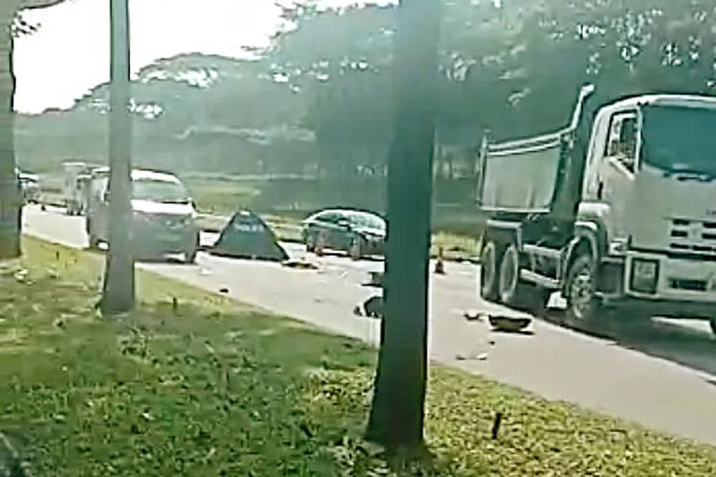 (早报讯)男子在快速公路骑电单车时,闪避不及撞上刹车的货车,导致后座女友抛飞后被一辆倾斗罗厘撞及,当场死亡。