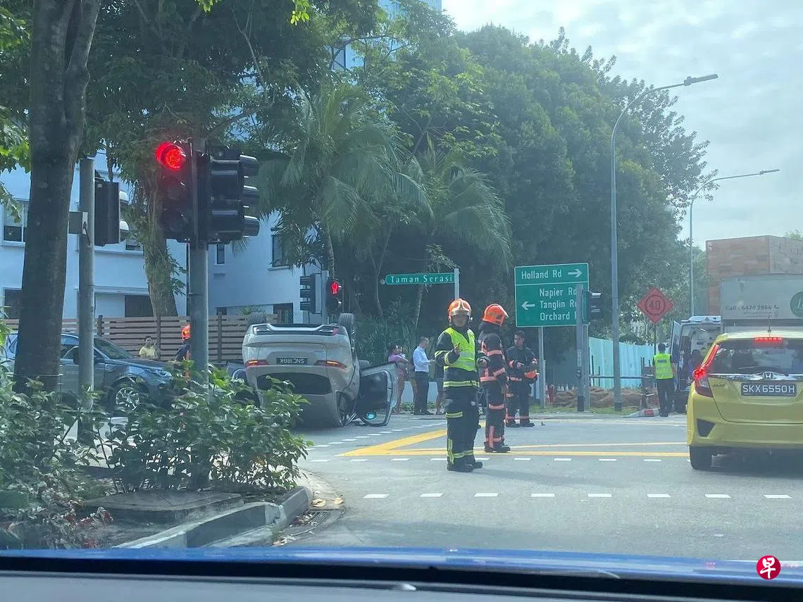 根据Telegram群组照片显示,在交通灯前,一辆白色汽车四轮朝天,两边车门打开,车灯亮着,车身挡住了至少两条车道。民防人员与警员到场救援。
