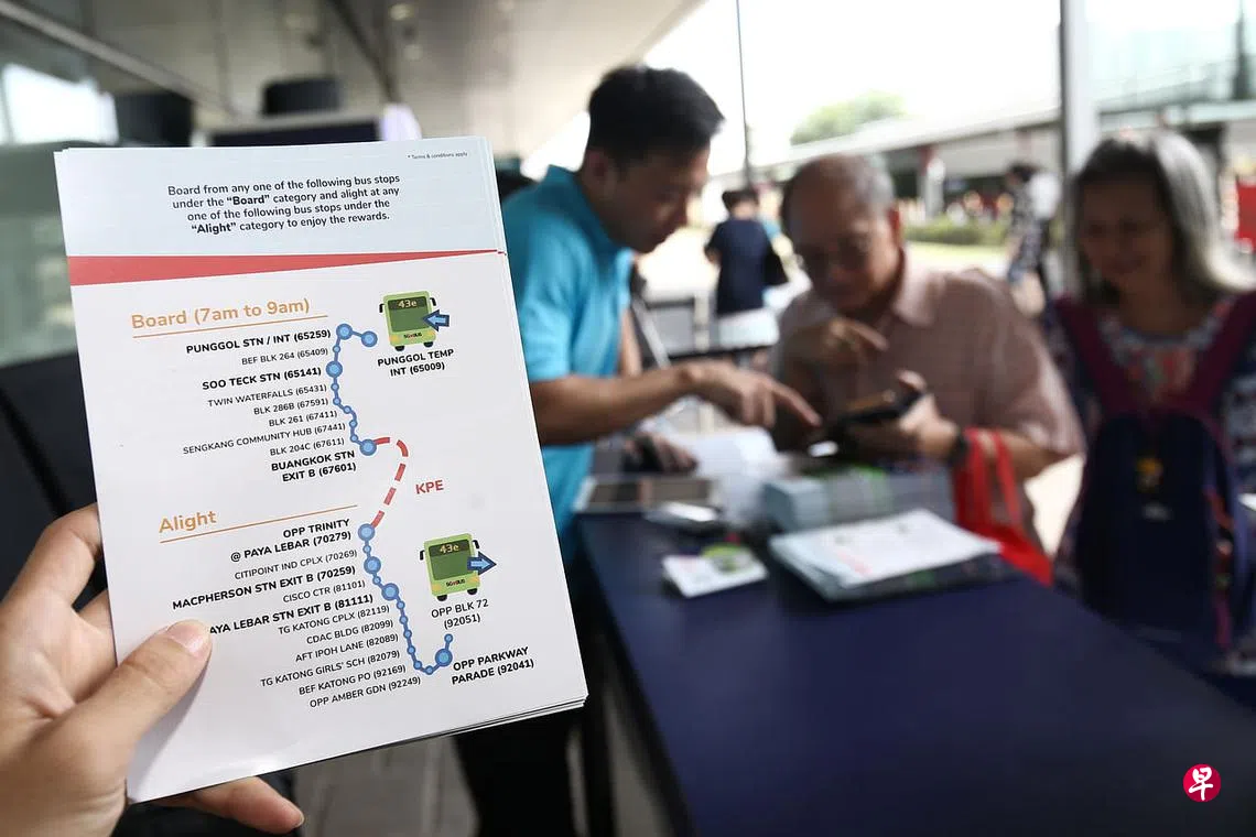 之后,乘客只要在平日早上7时至9时之间改搭上述巴士,并在大成、麦波申、巴耶利峇、百汇广场(Parkway Parade)、珊顿道或滨海林荫道下车,每趟行程可赚取150分(相等于1元5角)。累积至少500分后,便可将分数转换成5元奖励金。