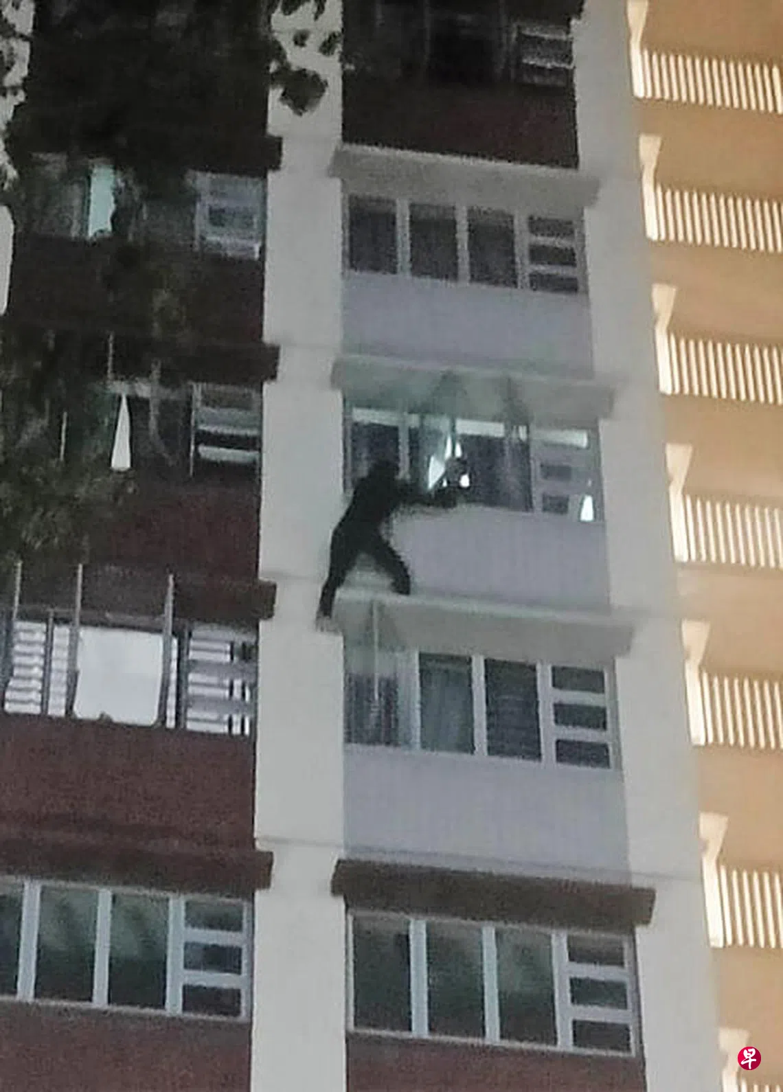 (早报讯)男子为躲避肃毒员爬出九楼单位站在墙沿,肃毒员在把他从窗户外拉回安全地带后,当场逮捕他。其中一名肃毒员在尝试抓住不断挣扎的男子时,意外受伤送院。