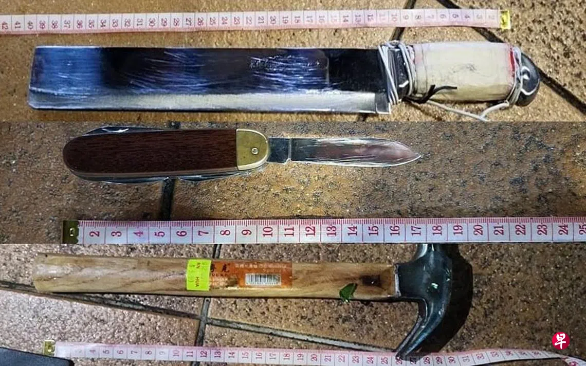 根据警方提供的照片,刀子长约39公分,瑞士军刀则长约17公分。
