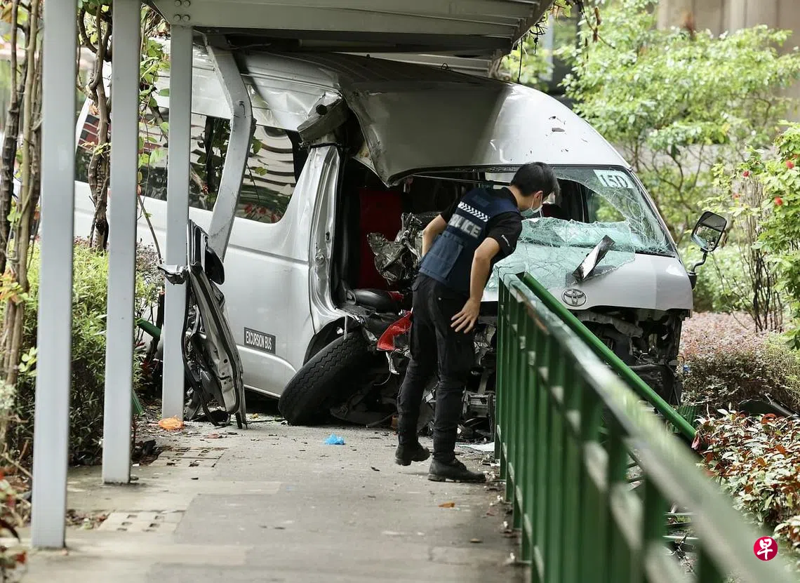 (早报讯)疑开车时突然昏迷,72岁男子第一天上班开小型校车出车祸,在红山地铁站外冲上行人道,撞上栏杆,导致车头严重损毁。民防人员到场后,立即将受困车上的司机救出,但他仍在送院后伤重不治。
