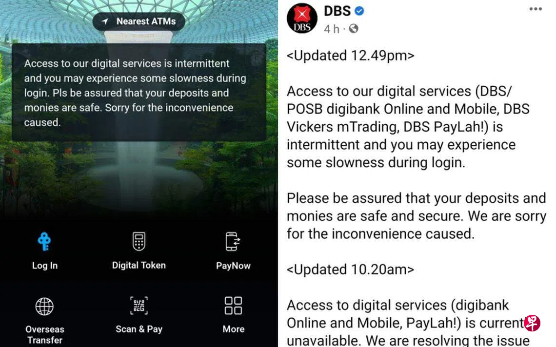 星展银行(DBS)星期三(3月29日)中午12时49分更新脸书贴文,作出上述表示,并向用户保证存款与资金仍然安全。