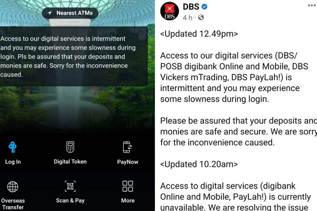 多名星展银行用户早上7时许开始无法登录数码服务,受影响的包括网络和手机版digibank,以及手机付款应用软件PayLah!。银行下午4时50分更新脸书贴文说,数码服务仍在恢复中,旗下所有星展银行和储蓄银行(POSB),以及星展丰盛理财中心(DBS Treasures Centres)分行星期三将延长营业两小时。