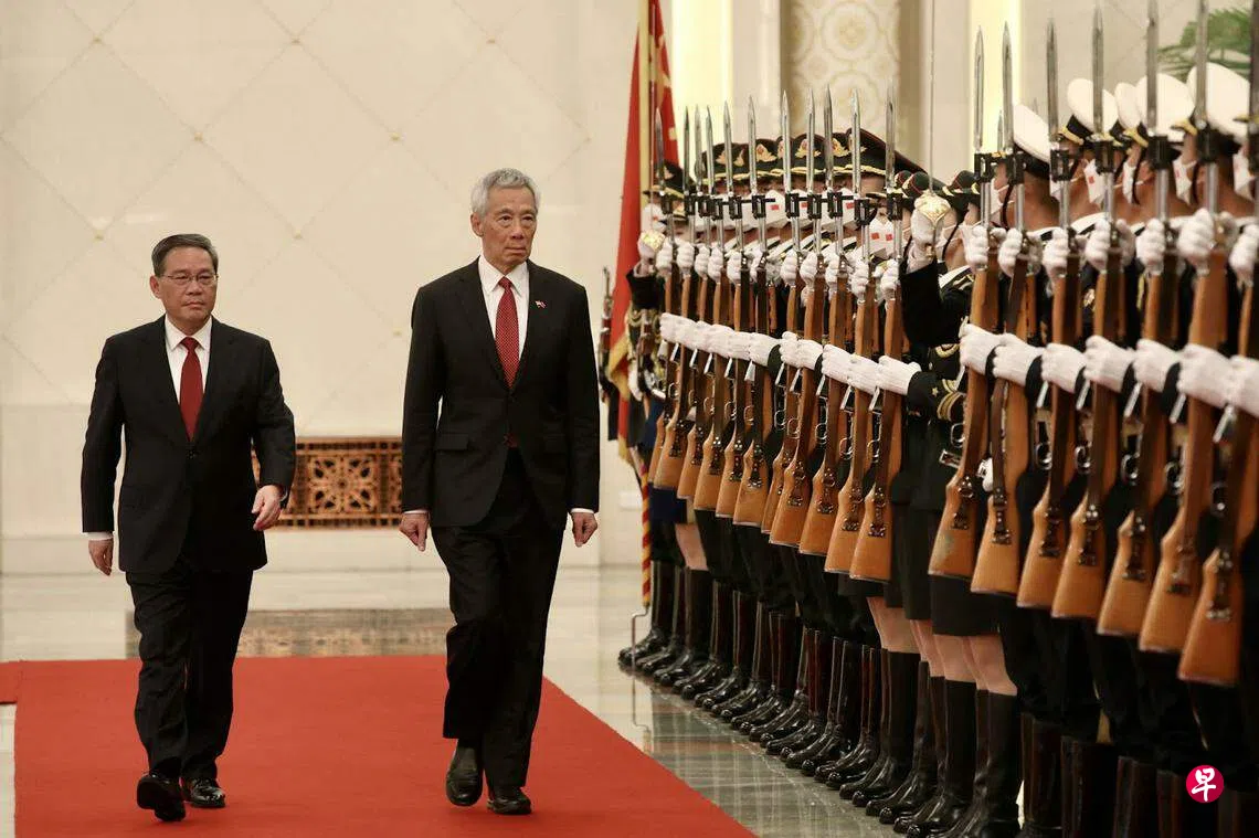 正在中国访问的李显龙总理今天(4月1日)在北京会见中国总理李强,两人会谈前,李强在北京人民大会堂北大厅为李总理举行欢迎仪式。