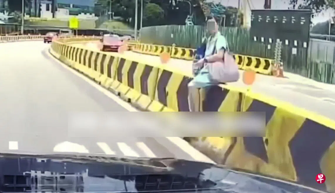 脸书专页SGRV上载一段时长36秒的视频,可见当时一名身穿浅青色衣服,两肩都背着大包物品的妇女,正坐在道路中央的混凝土分界堤上。