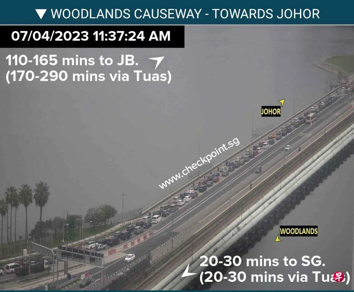 根据手机应用Checkpoint.sg估计,星期五(4月7日)中午约12时43分,从兀兰关卡入境马来西亚柔佛新山的越堤预计需要在110分钟至165分钟,即介于1小时50分钟至2小时45分钟,比早上9时许需要花140分钟至210分钟的情况,稍微缓解。