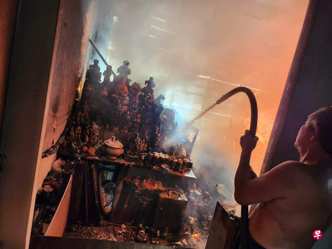 新加坡民防部队答复《联合早报》询问时证实在星期四下午约1时50分接获通报,火患涉及事发单位二楼的祭坛物品。消防员使用了一支水枪和压缩空气泡沫背包将火势扑灭。