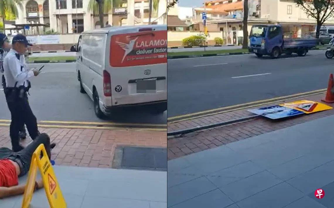 网上流传的视频显示,一个路牌被撞倒在人行道上,疑似肇祸的白色货车打横占据了一条车道。当警员接近相信是货车驾驶员的男子时,他正躺在路边的台阶上睡觉。