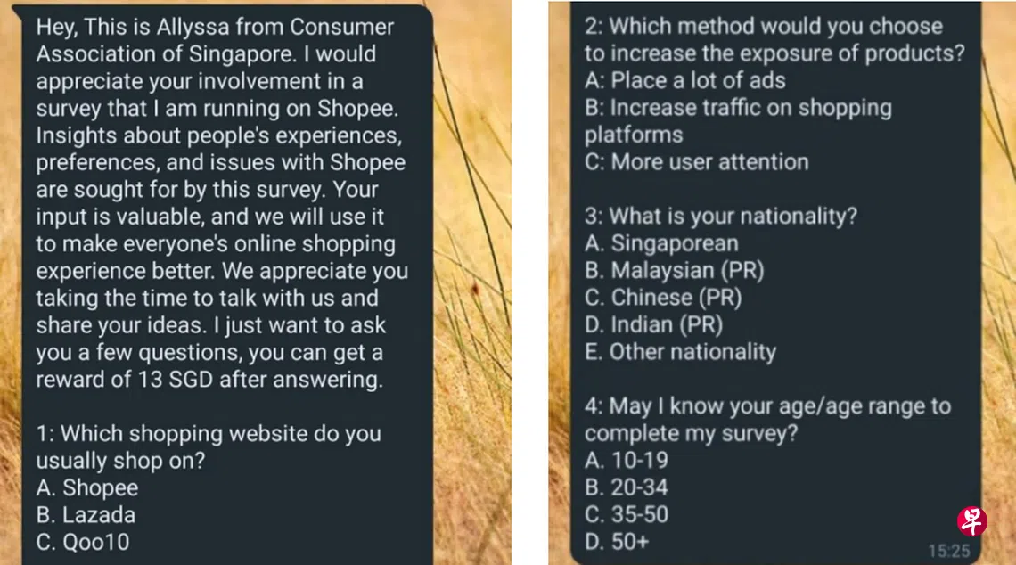 收信人只要答复有关个人资料(包括国籍和年龄)和常使用购物平台的问题,即可得到13元奖励金。
