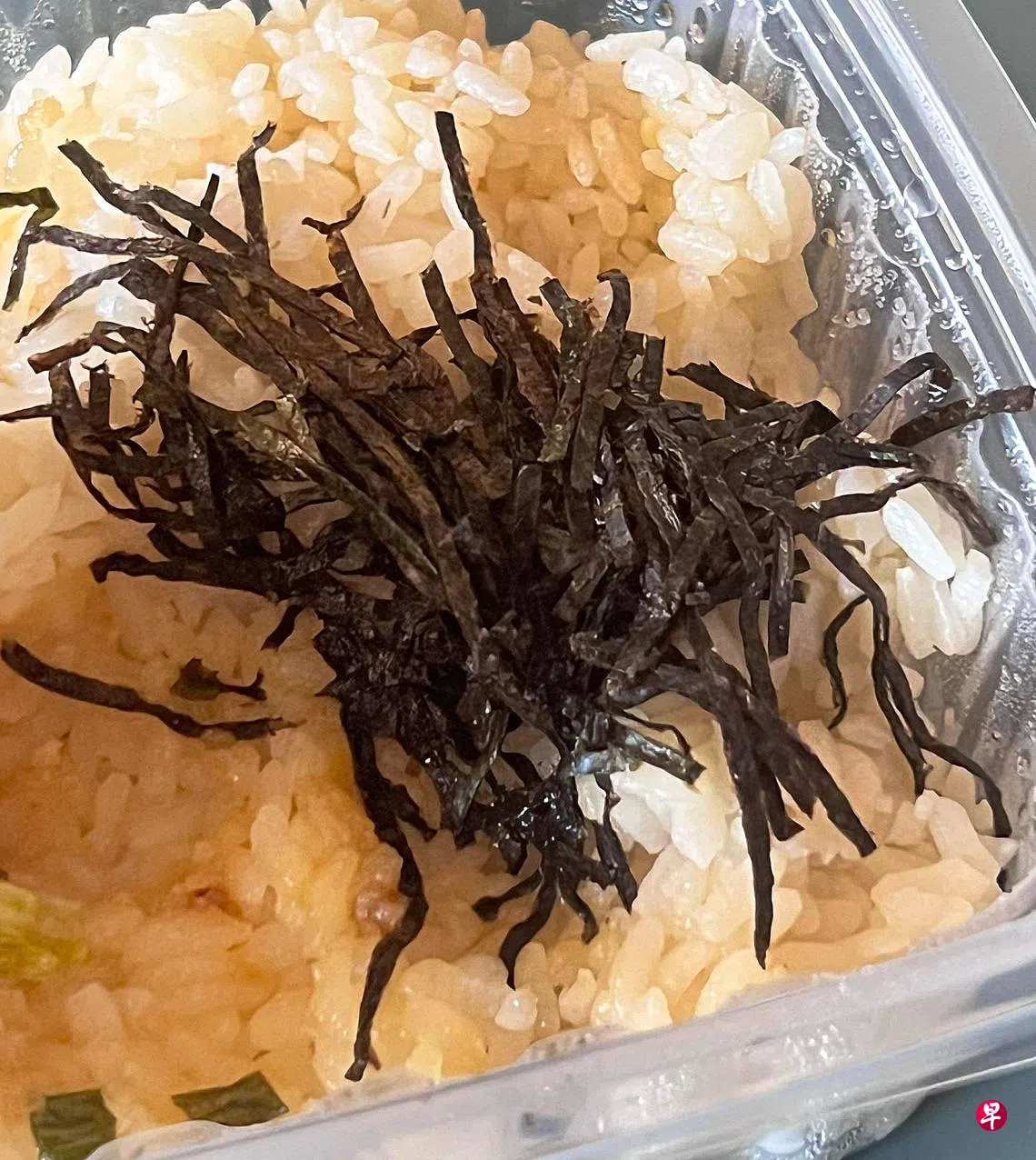 他上周三(4月12日)收到餐盒时发现,四道菜的其中一道是白饭加海藻。