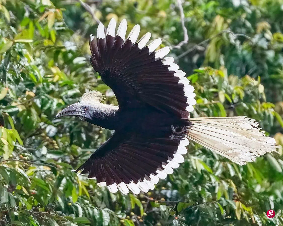鸟类爱好者周德发(51岁)日前在脸书上发文指出,他于星期天(4月16日)在乌敏岛拍摄到罕见白冠犀鸟,也分享了多张他所拍摄的照片,获网民留言赞赏。