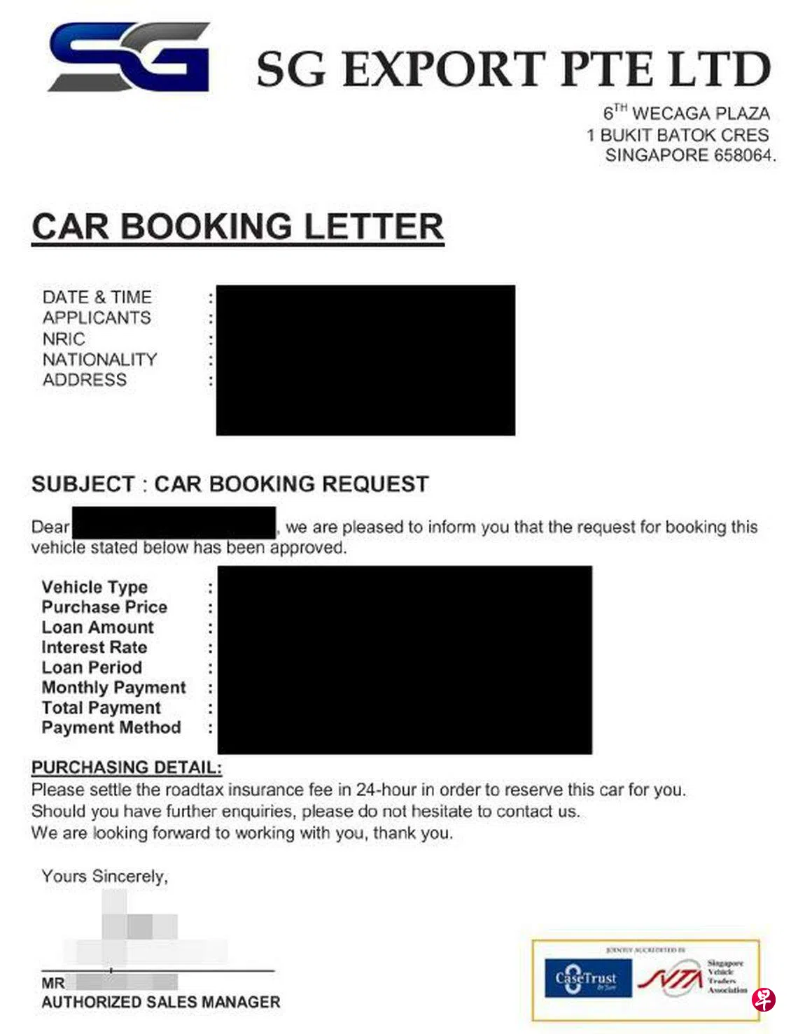 新加坡消费者协会星期二(4月25日)发文告说,消协于4月14日接获通报,一名住在马来西亚的消费者指自己在4月10日向汽车销售商SG Export有限公司付订金购买一辆汽车。业者之后向消费者索讨更多钱,却没有提供任何文件,仅给出一张印有“消协—新加坡车业公会保证标志鉴定计划”(CaseTrust-SVTA accreditation scheme)标志的订单。