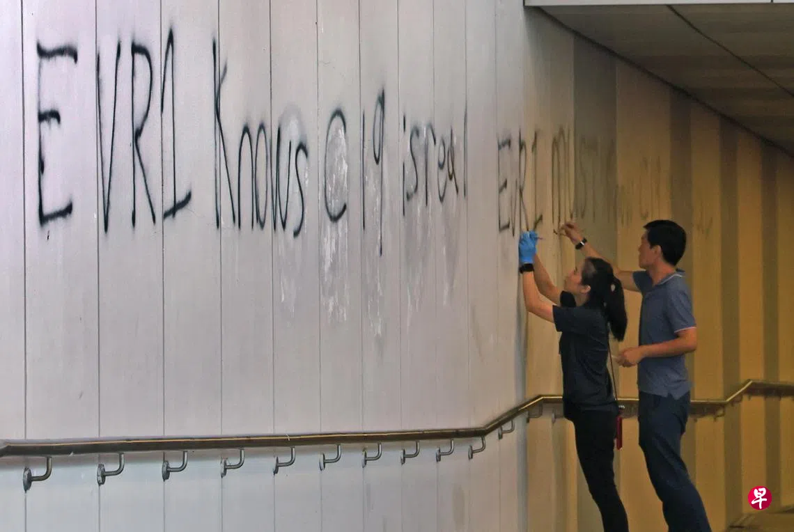 通往肯特岗地铁站的地下通道疑有人恶作剧,在墙上喷漆涂鸦,警方到场调查。