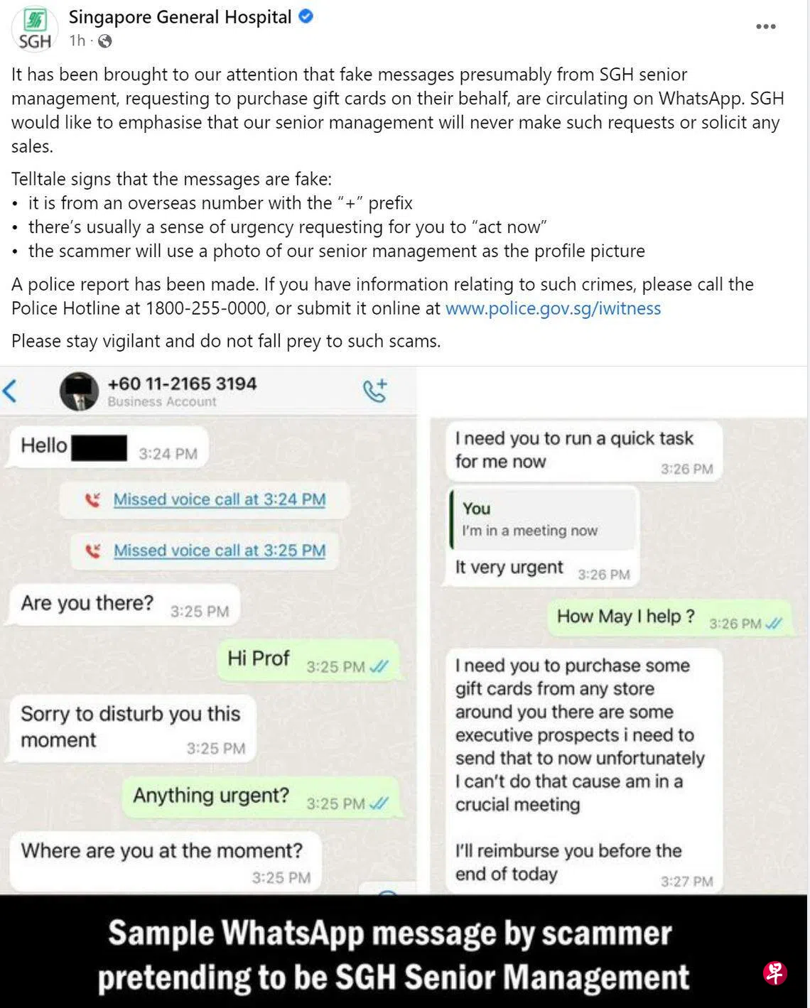 中央医院在脸书贴文中强调,医院高层绝对不会发出这类请求或进行兜售行为。“我们已经报警。公众如果有与此类犯罪相关的信息,请拨打警方热线1800-255-0000,或到www.police.gov.sg/iwitness网站提交。”