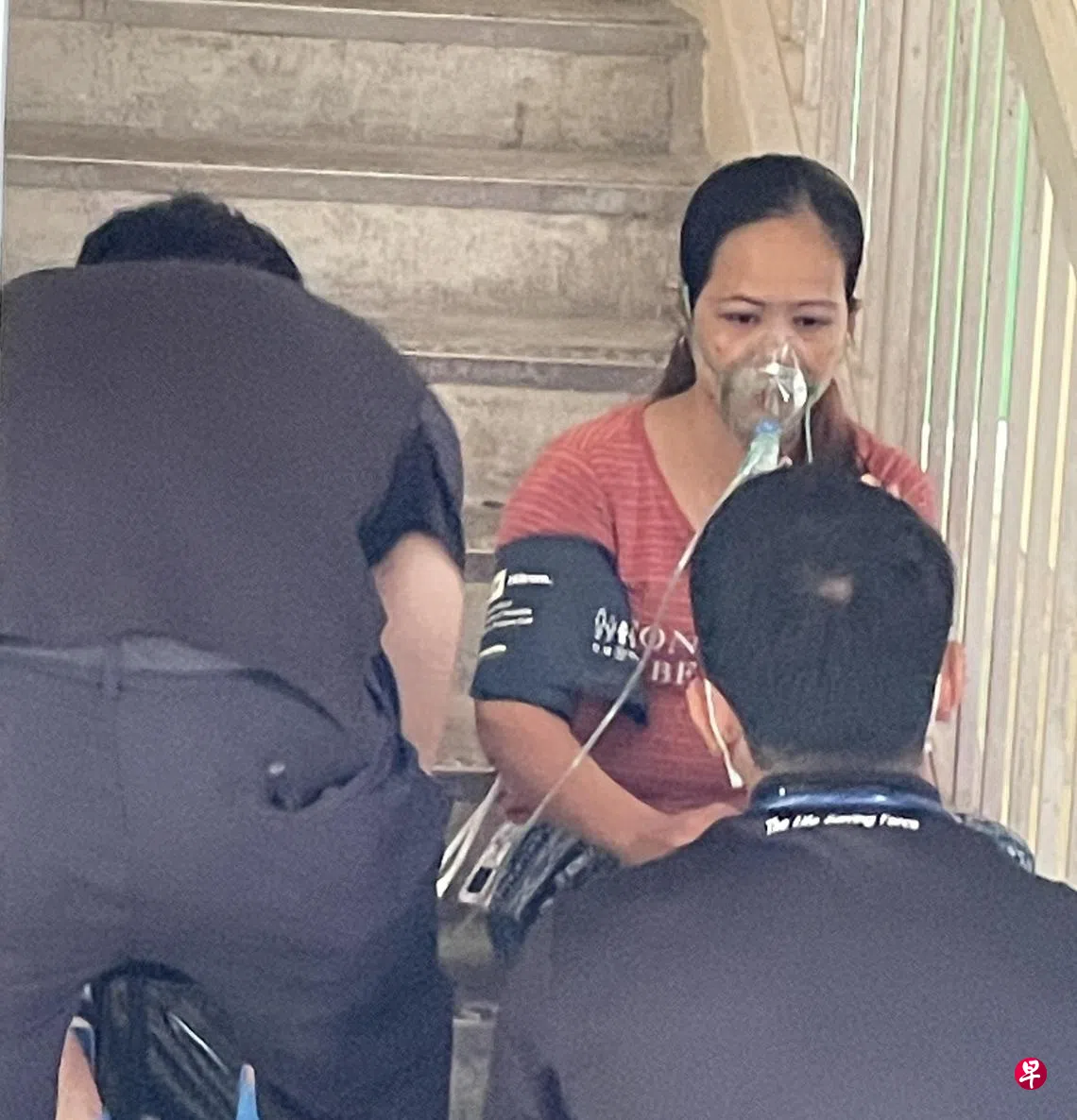 据观察,该层楼有七个单位,事发后女佣坐在楼梯口,戴着氧气罩,数名民防人员在旁给予协助,他们随后把女佣扶上担架推进救护车,送往医院。