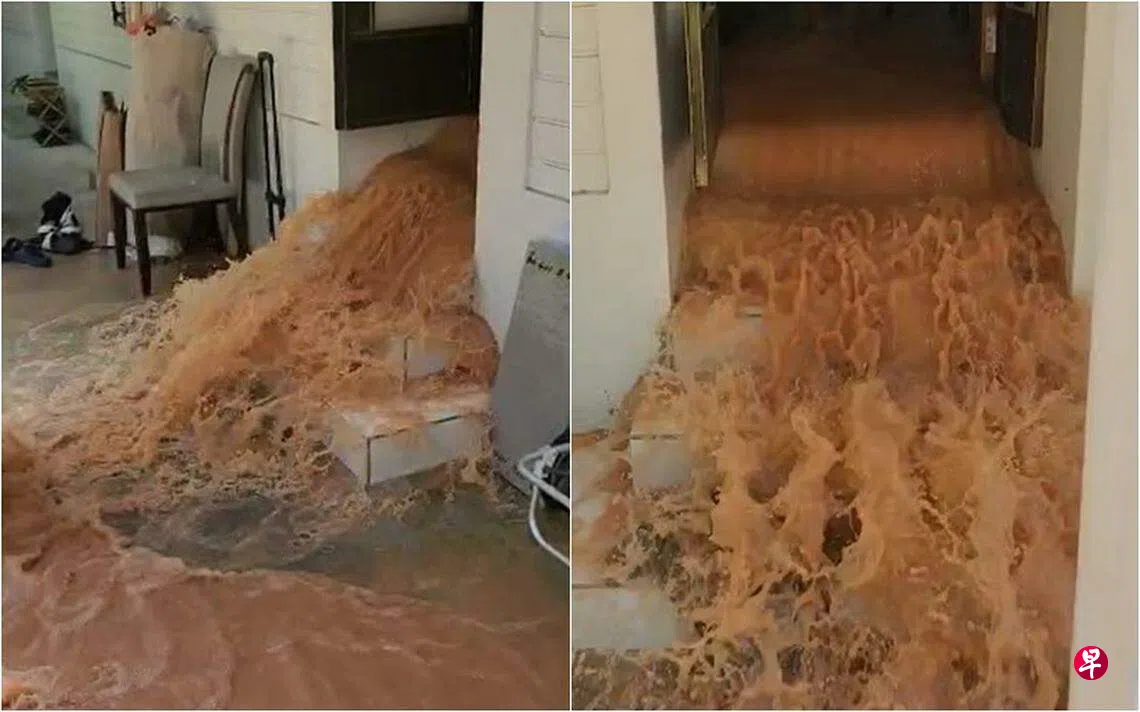 拉欣说,他们还来不及反应,厨房和厨房厕所的排水孔也开始涌出大量泥水,而且都往客厅流过,从门口流到外头去。“我们过后通知市镇理事会,对方派人上门查看后却表示得继续等,直到公用事业局人员到场才能关闭水管。”