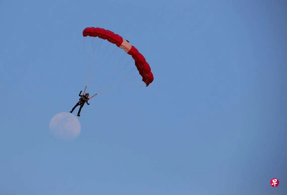 为进一步磨炼跳伞技能,应对更具挑战的风势和降落区,红狮跳伞队拉队到国外接受高强度跳伞训练。国庆庆典今年将在政府大厦前大草场举行,跳伞降落区也比去年的浮动舞台大一倍。