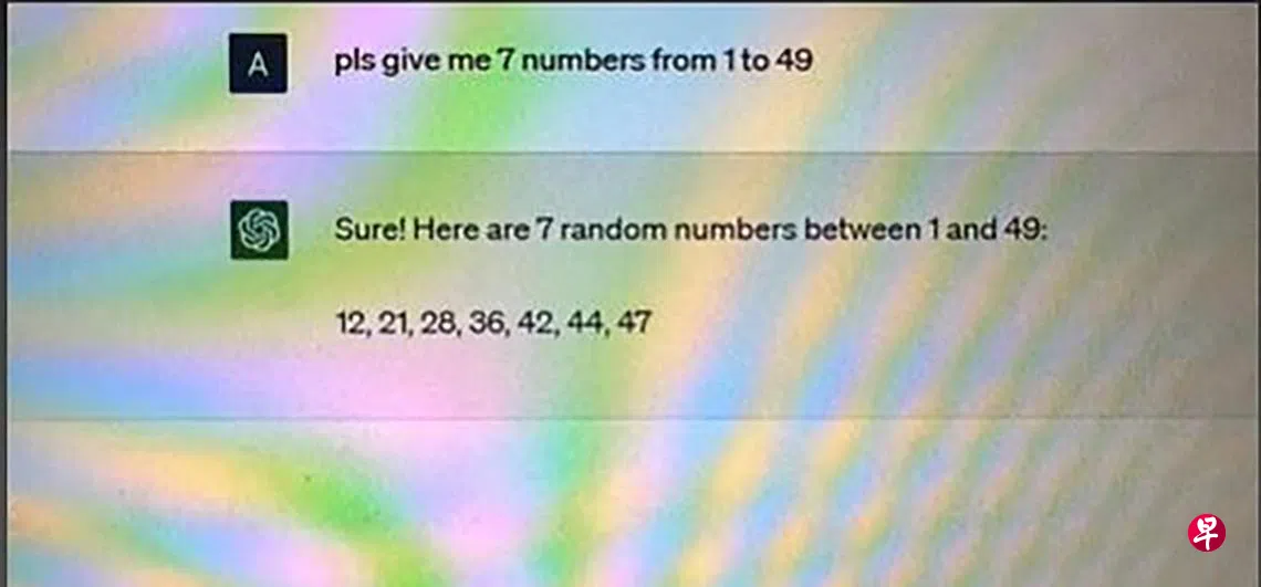 一名陈姓男网民日前在社交媒体TikTok上载一段短视频,称使用人工智能聊天软件ChatGPT,要求从1至49当中选七个号码,好让他下注星期四(5月4日)开奖的多多博彩。