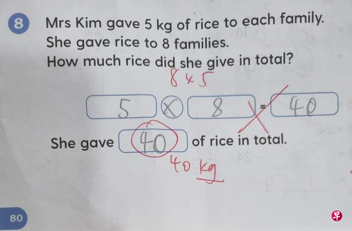 她也说,以照片中的题目为例,正确的答案应该是八个家庭各获得五公斤白米,因此算式应该是八乘五等于40,然后再最后写答案的时候,要附上单位“公斤”。
