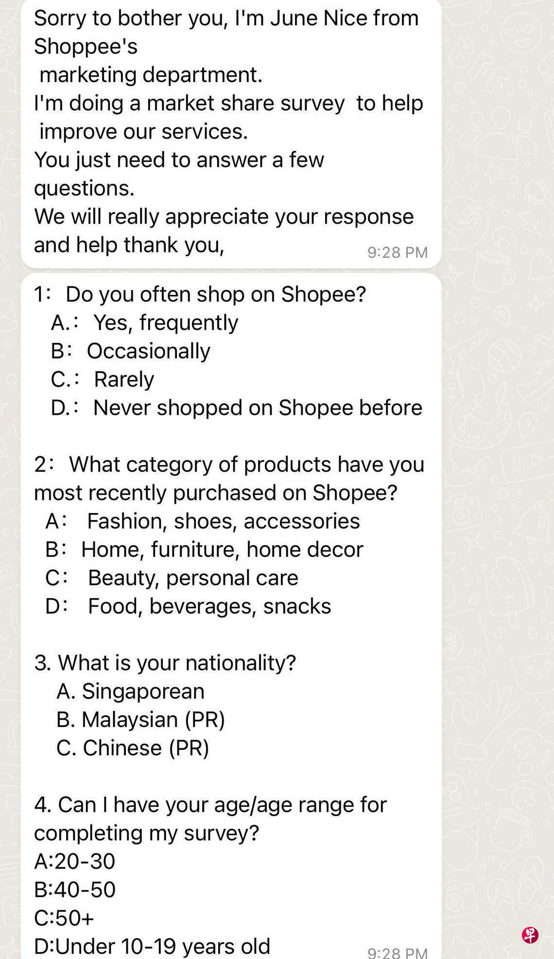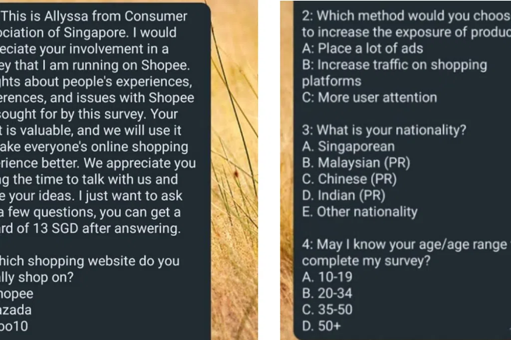 《联合早报》读者投诉收到诈骗信息,发消息者自称是Shopee市场部的员工,通过WhatsApp向部分公众发送市场调查,以了解公众在Shopee的购物满意度,以及了解他们的购物偏好。完成调查的公众据称还能获得11元奖励。