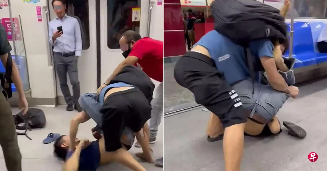 两男在地铁车厢内上演铁公鸡,一个用剪刀脚夹住对方,一个反掐对方颈项,两人因滋事打架齐齐落网。