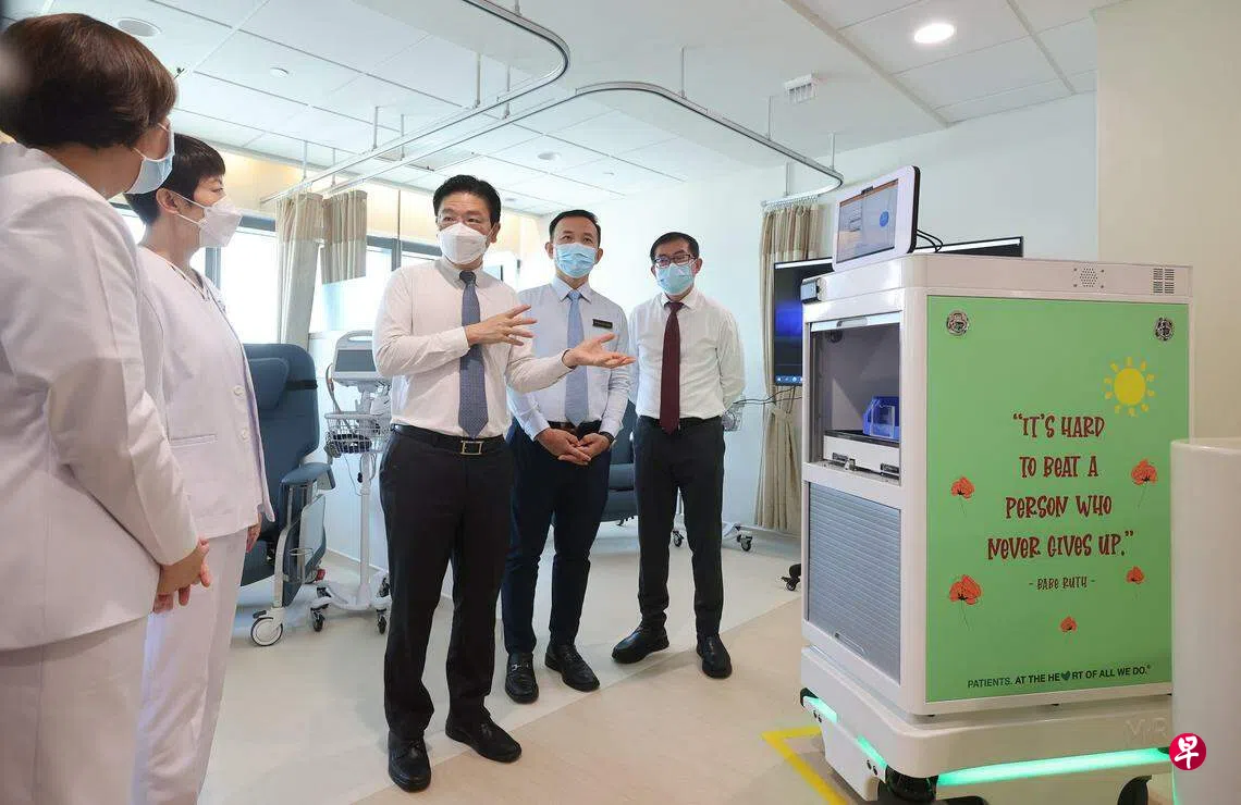 随着人口迅速老龄化和癌症患病率上升,新加坡国立癌症中心新建的24层大楼比以前的6层大楼大五倍,门诊室和化疗椅与化疗床数量接近翻倍,也启用了机器人为病患递送药物。